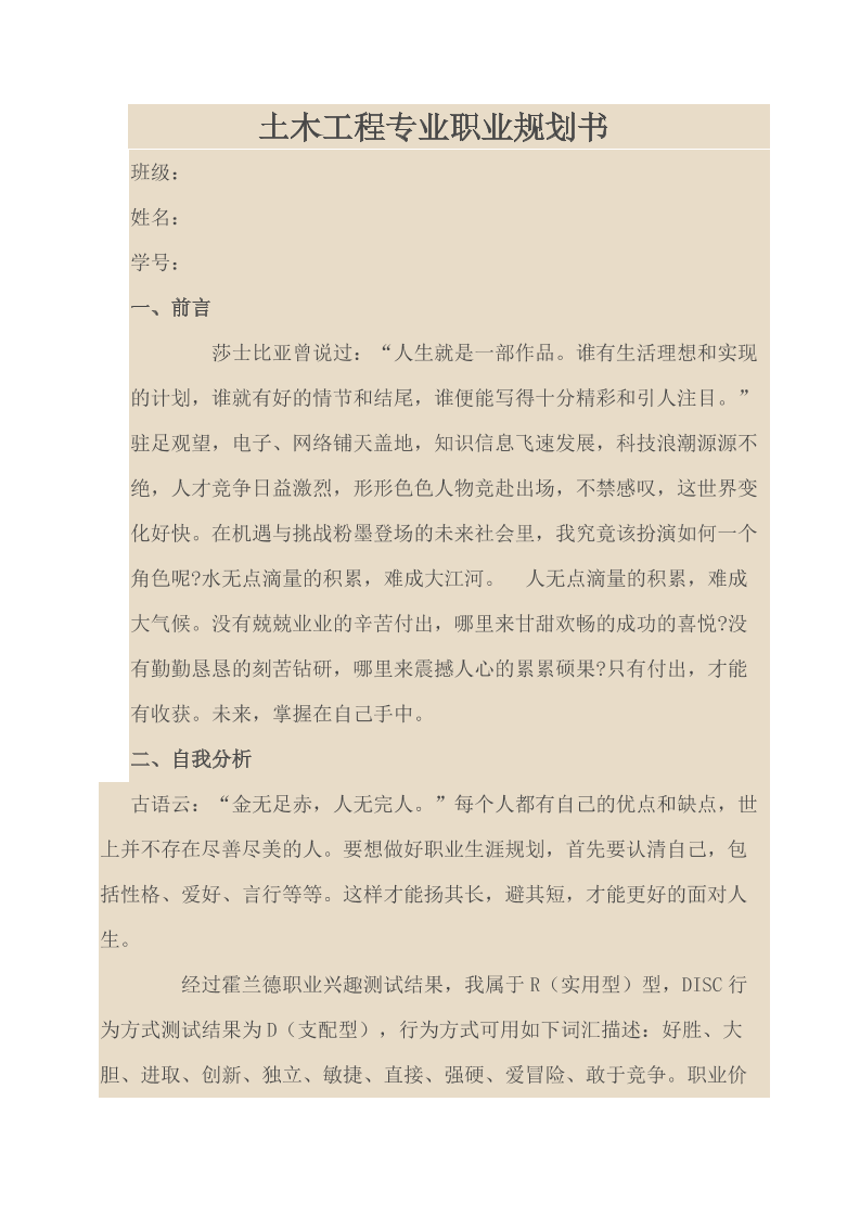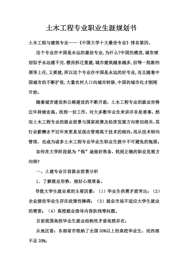 大 学 生 土 木 工 程 职 业 生 涯 规 划 书
