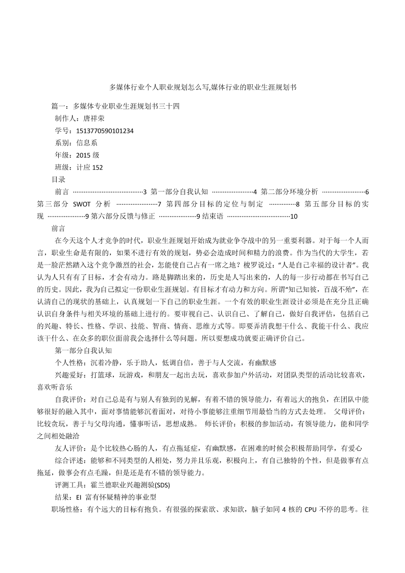多媒体专业职业生涯规划书六